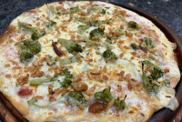 Muzzarela, brócolis, gorgonzola, alho frito e azeitonas pretas