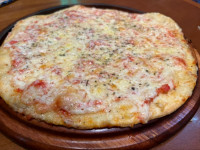 Muzzarela, com rodelas de tomate, parmesão ralado e azeitonas pretas