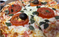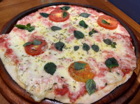 Muzzarela de búfala, rodelas de tomate, manjeiricão e azeitonas pretas