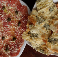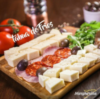 Queijo mussarela, mussarela búfala, parmesão, peperoni, lombinho, presunto di parma, rúcula e azeitonas.